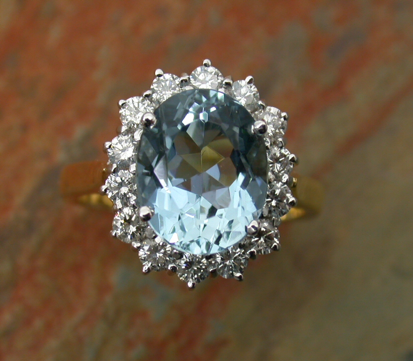 designed as an oval cluster, the central claw set oval cut aquamarine within a surround of round brilliant cut diamonds
