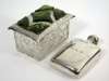 with marks for London 1917, maker Brook & Son, of rounded rectangular form with hinged cover, initialled; together with a mounted glass box, Birmingham 1905, the pull-off cover with Celtic engraved borders and set with five polished green stone panels (2)
