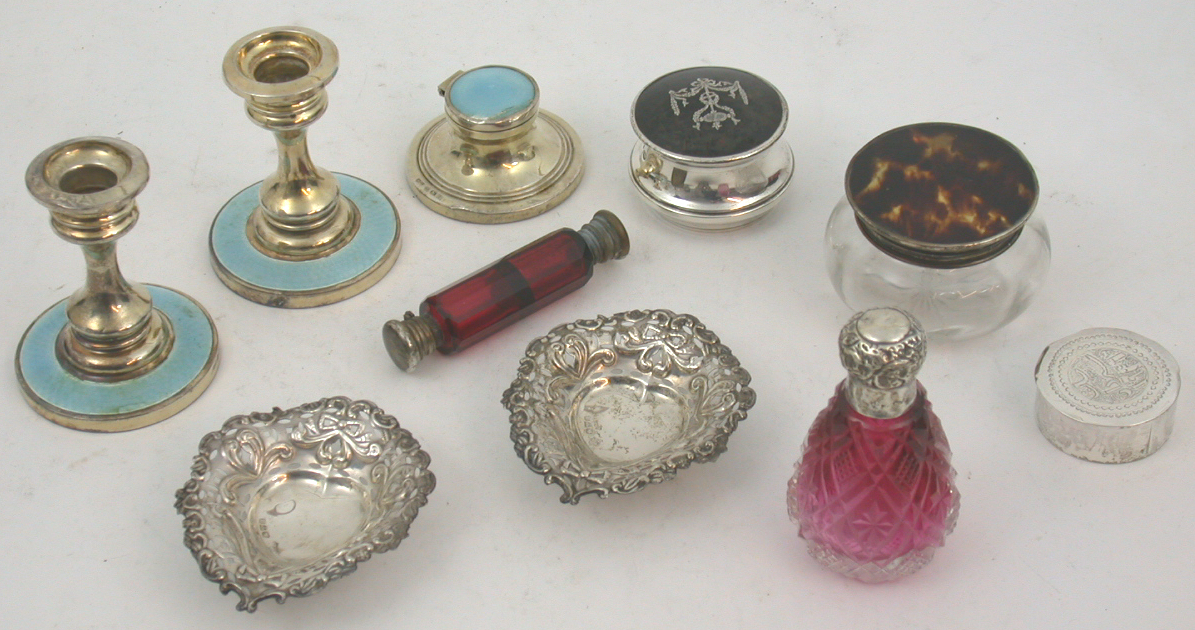 with marks for Birmingham 1922 and 1923, maker probably H. C. Davis, to include a capstan inkwell and a pair of matching desk candlesticks, each of circular outline; a circular trinket box with pique work decorated hinged cover, London 1919 (A/F); another silver and tortoiseshell mounted glass jar, Birmingham 1923; a pair of pierced heart shaped bon bon dishes, Chester 1900; two mounted glass scent bottles and a circular box and cover (10)
