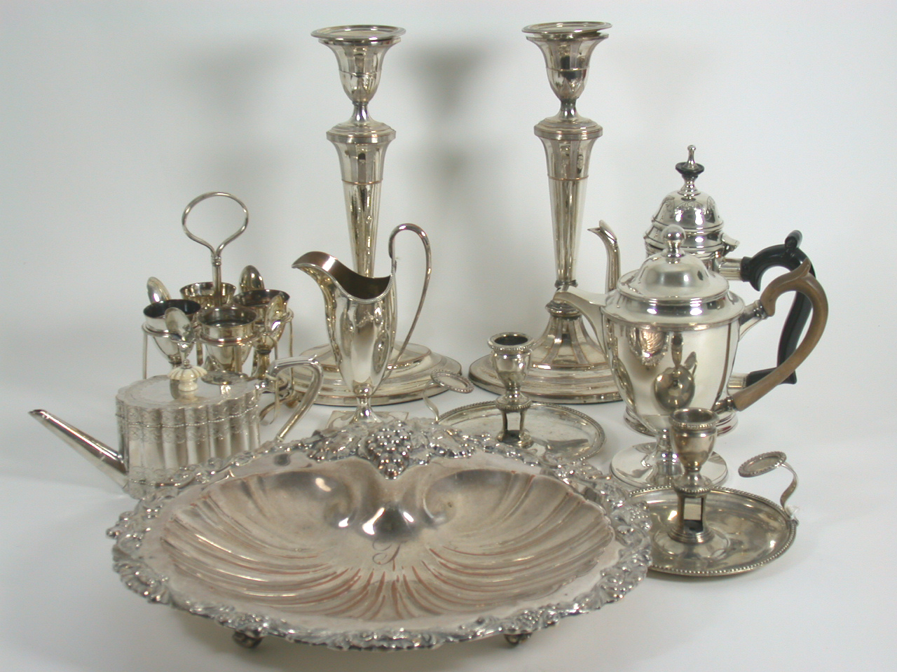 to include a pair of candlesticks of oval outline; a pair of chambersticks with beaded rims; a helmet form cream jug; an egg cruet; a bachelor's teapot; a coffee pot; a hot water pot and a large fruit dish with fruiting vine cast edge (qty)