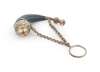 unmarked, the bloodstone formed body shaped as a Scottish powder horn with applied shield cartouche and thistle head final set with a foil back crystal, the domed hinged cover embossed with thistles and centrally set with a collet set foil backed crystal, opening to reveal a hinged, pierced and engraved foliate grille, with double belcher link suspension chain