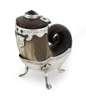 the curly horn mull of conventional form, with scalloped collar engraved 'Geoe Handley West High St Salford' with butterfly hinge to horn cover, collet set amethyst to centre, the whole resting in a 'cradle' formed stand with engraved border and raised on three hoof feet