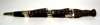 the carved and studded handle with six bands of Celtic knot work and with collet set facetted stone (probably later mounted), the wide simple steel blade marked NORRIE GLASGOW, the japanned later scabbard set with bi-knife and fork and with simple thistle decorated mounts, the bi-knife and fork with studded and carved wooden handles with simple engraved mounts