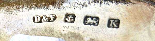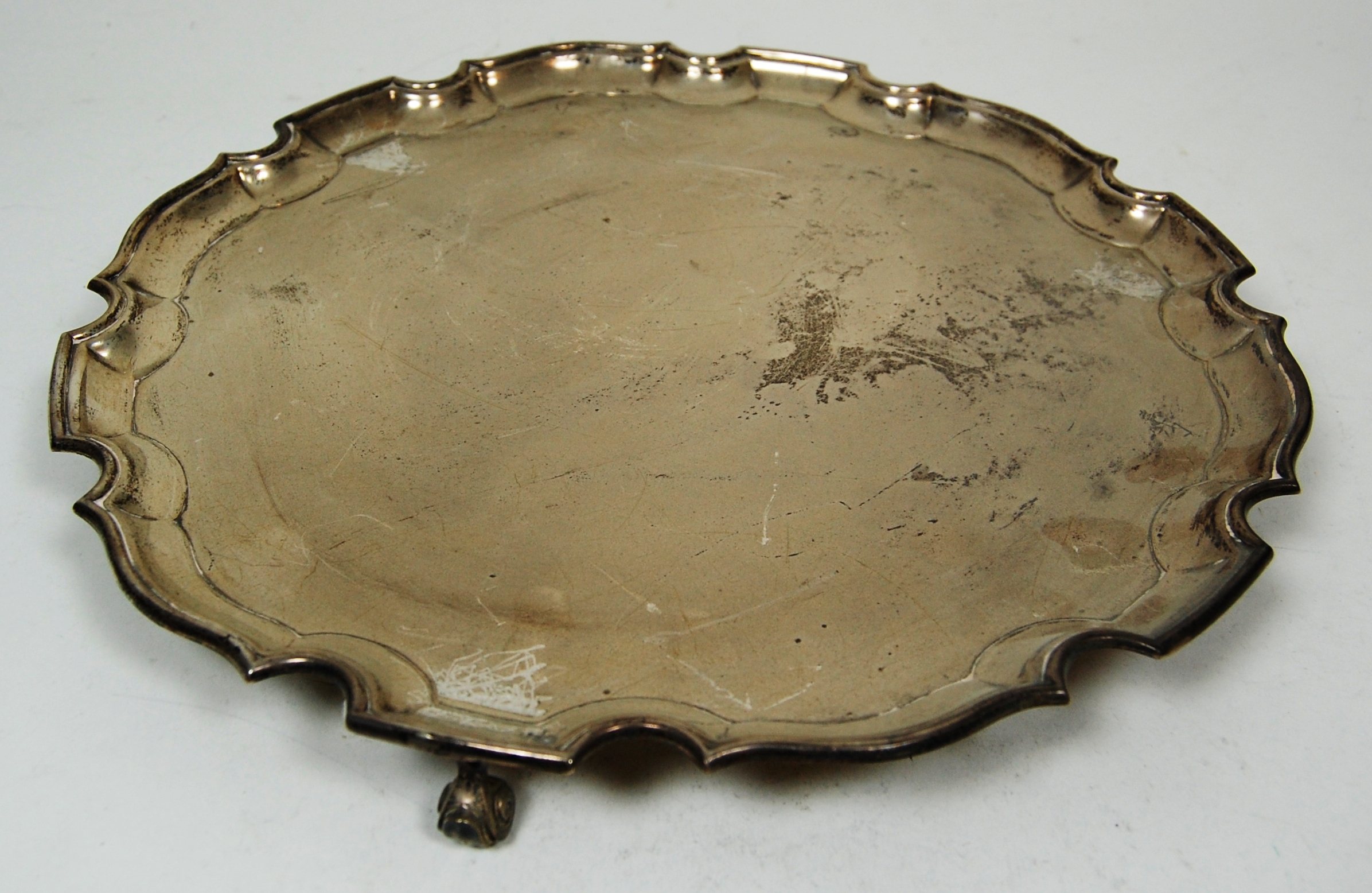 Adie Brothers Ltd, Birmingham 1935, of circular form with scalloped rim and engraved crest to the centre, on four hoof feet