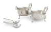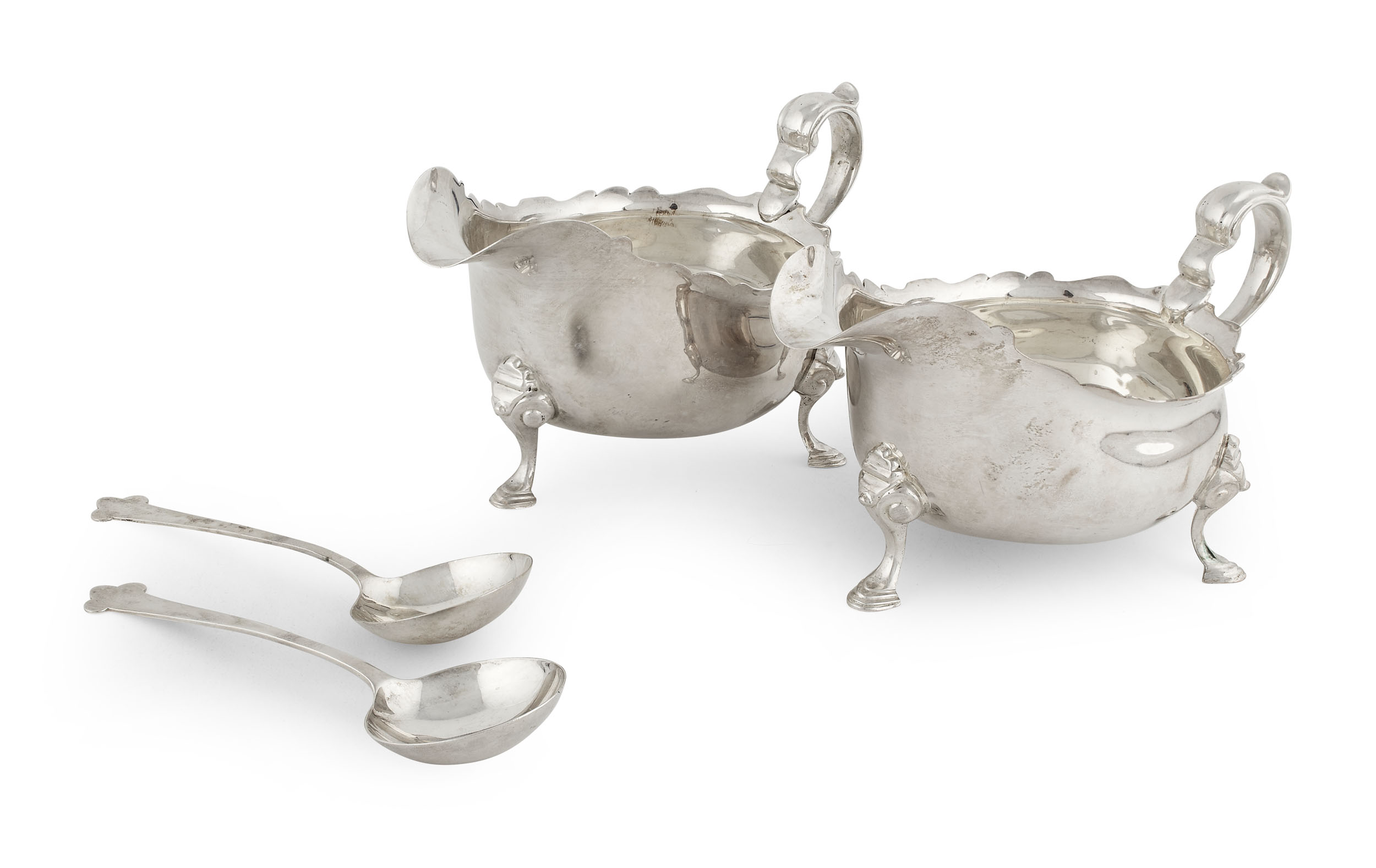 Davidson, Henderson & Sorley (of Glasgow), Birmingham 1934, the bellied bodies with everted scalloped rim and wide pouring spot, with S scroll handle and raised on three trefid terminal feet, with two matched trefid terminal spoons by Aidie brothers, in fitted case