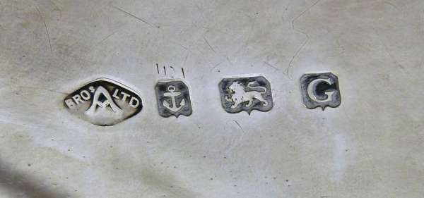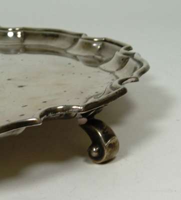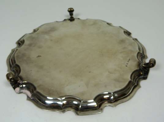 Aidie Brothers, Birmingham 1931, of scalloped outline with crest engraved to centre, raised on three scroll feet