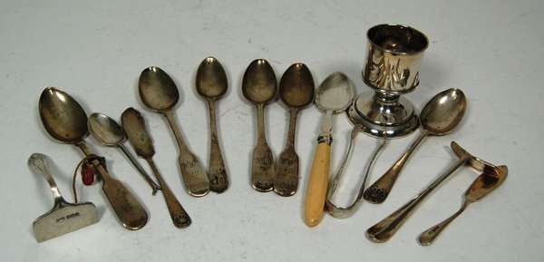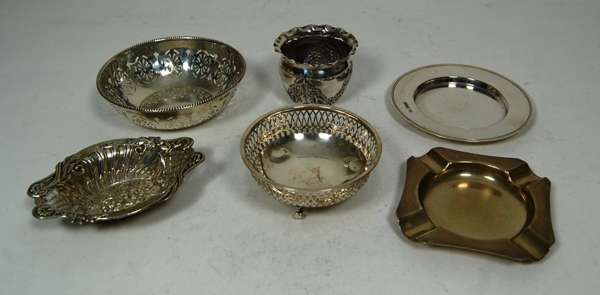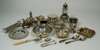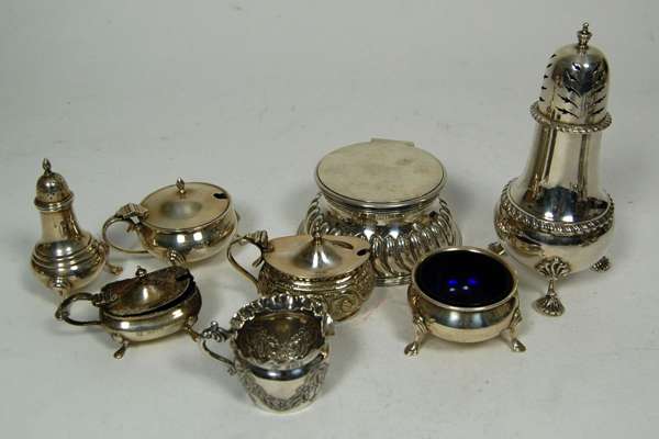 to include a sugar caster, Birmingham 1929, of baluster form with threaded detail and four shell feet, an early 20th century inkwell; a collection of cruets and bon bon dishes (qty)