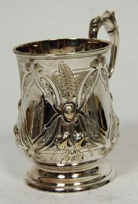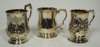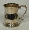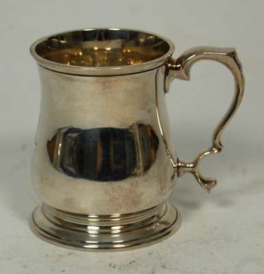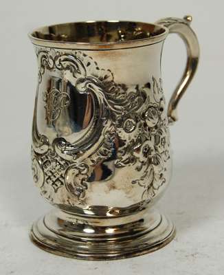 to include a simple baluster example London 1923; a later decorated George III baluster example, London circa 1800, with foliate garlands and cartouche; and a Victorian silver plated example with conjoined initials within foliate borders (3)