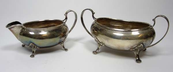 Birmingham 1916, comprising teapot, twin handled sugar bowl and milk jug, of plain tapered form raised on four foliate fluted feet, with C scroll handles (3)