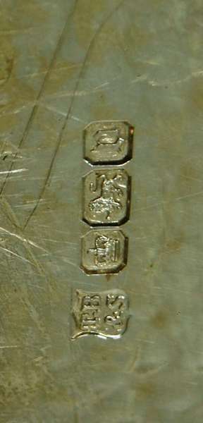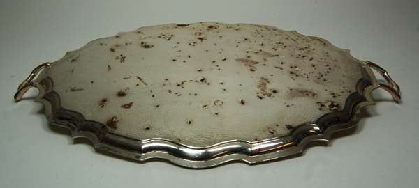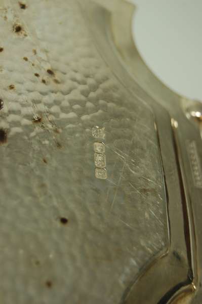 T Bradbury & Sons, Sheffield 1913, of shaped oval outline with moulded scalloped rim and loop handles the centre with planished finish and plain central cartouche