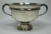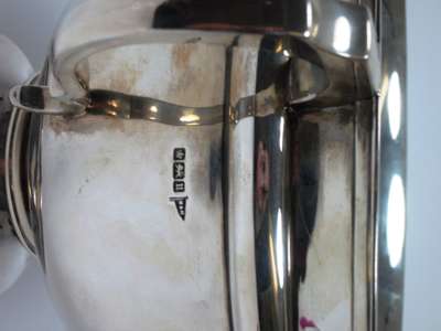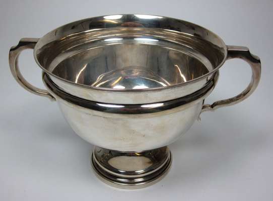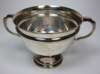 Walker and Hall, Sheffield 1912, the tapered body with large rim and twin angular handles, raised on a domed foot