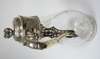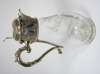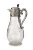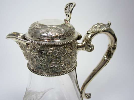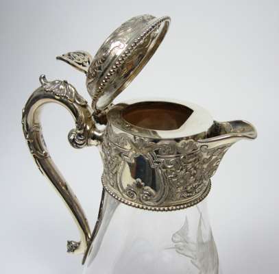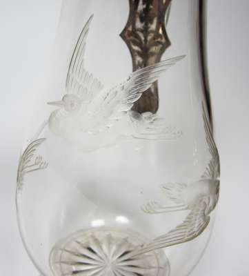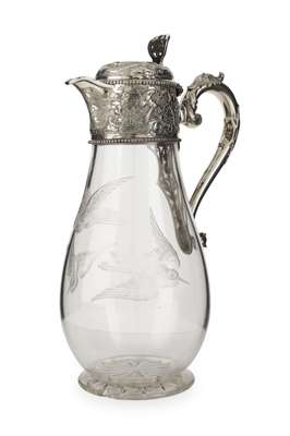the baluster glass body engraved with three heron in flight, on star cut base, the plated mounts and handle with intertwined foliate decoration and S scroll handle, the hinged cover with pierced thumbpiece
