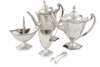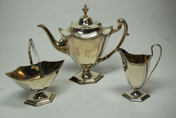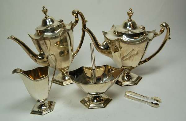 Walker & Hall, Sheffield 1910, comprising waterpot, tea pot, twin handled sugar bowl and milk jug, the tapered bodies each of panelled form with reeded rim and strap work handles, on simple short stem and spreading panelled foot; together with a matched pair of sugar tongs (5)