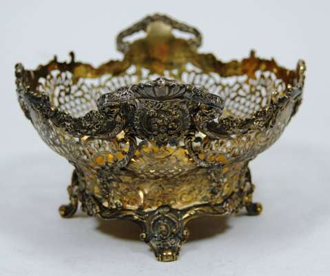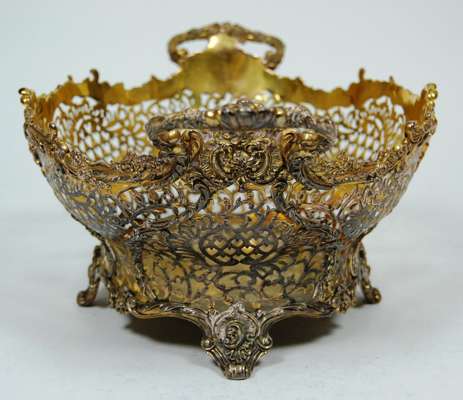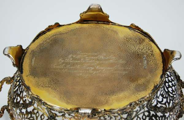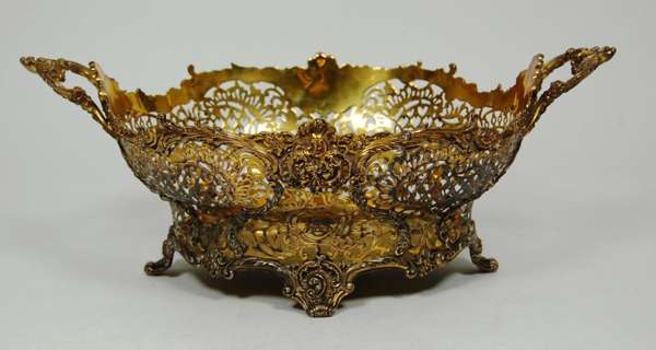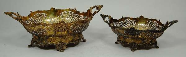 Reid & Sons, London 1910, of oval shape with pierced foliate decoration and scalloped rim on four scrolling bracket feet; together with a smaller example, Reid & Sons 1912, both with presentation inscription to the underside (2)