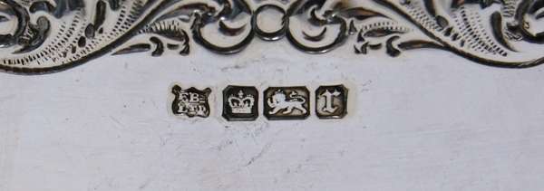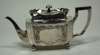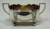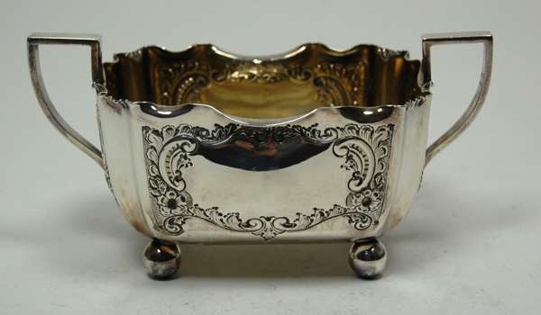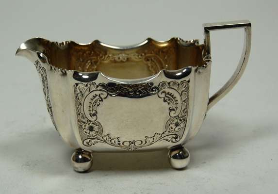 Sheffield 1909, comprising teapot, twin handled sugar bowl and milk jug, the tapered bodies with scalloped rims and embossed panels of foliate scrolls and flowerheads, with angular handles and raised on ball feet (3)