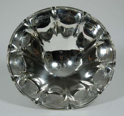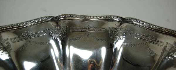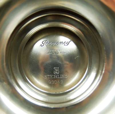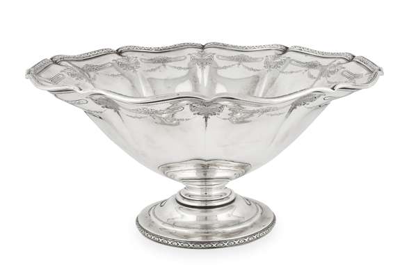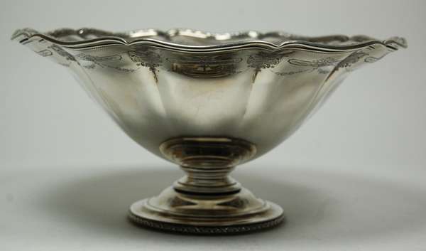 marked Regency, STERLING, the tapered bowl with scalloped rim and embossed pendant swags and floral plaques, the centre of bowl with script initial D, raised on a pedestal foot