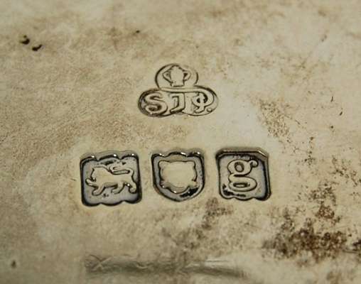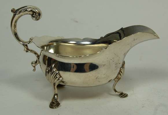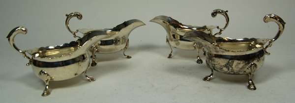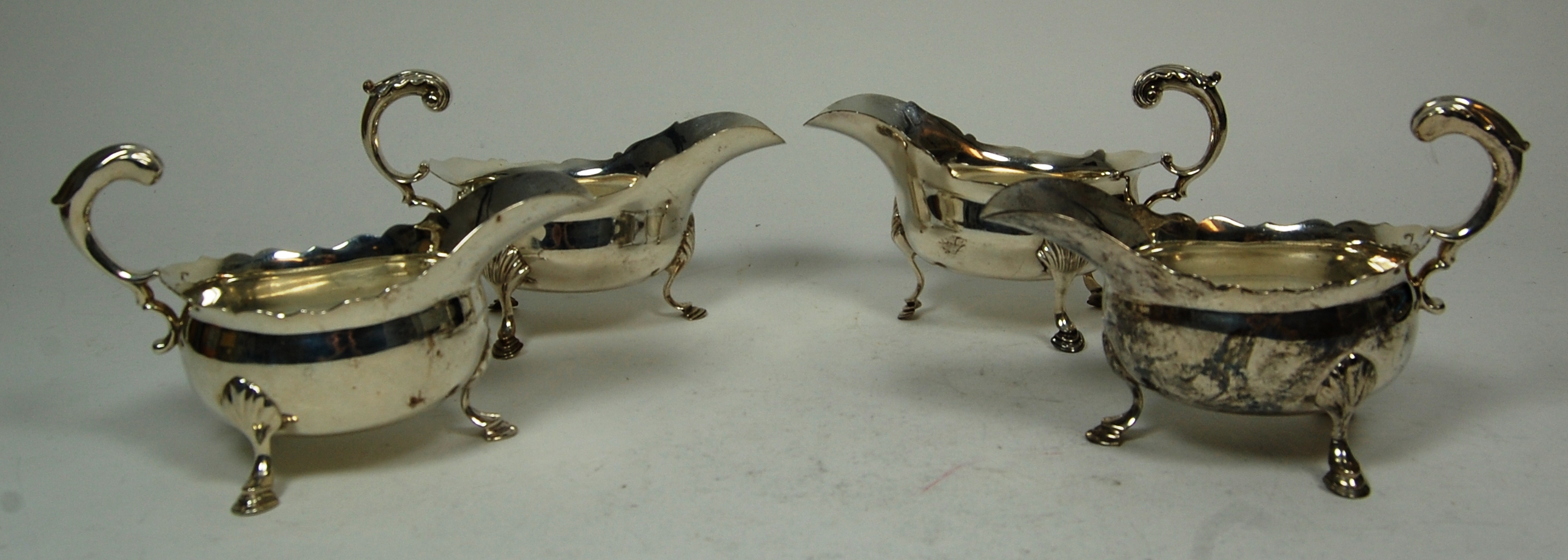 S J Phillips, London 1902 of traditional form, with an open scrolled handle and everted scalloped rim on three hoof feet, together with a similar pair James Wakely & Frank Clark Wheeler, London 1901 (4)