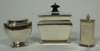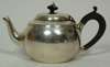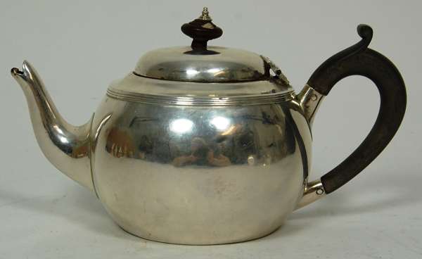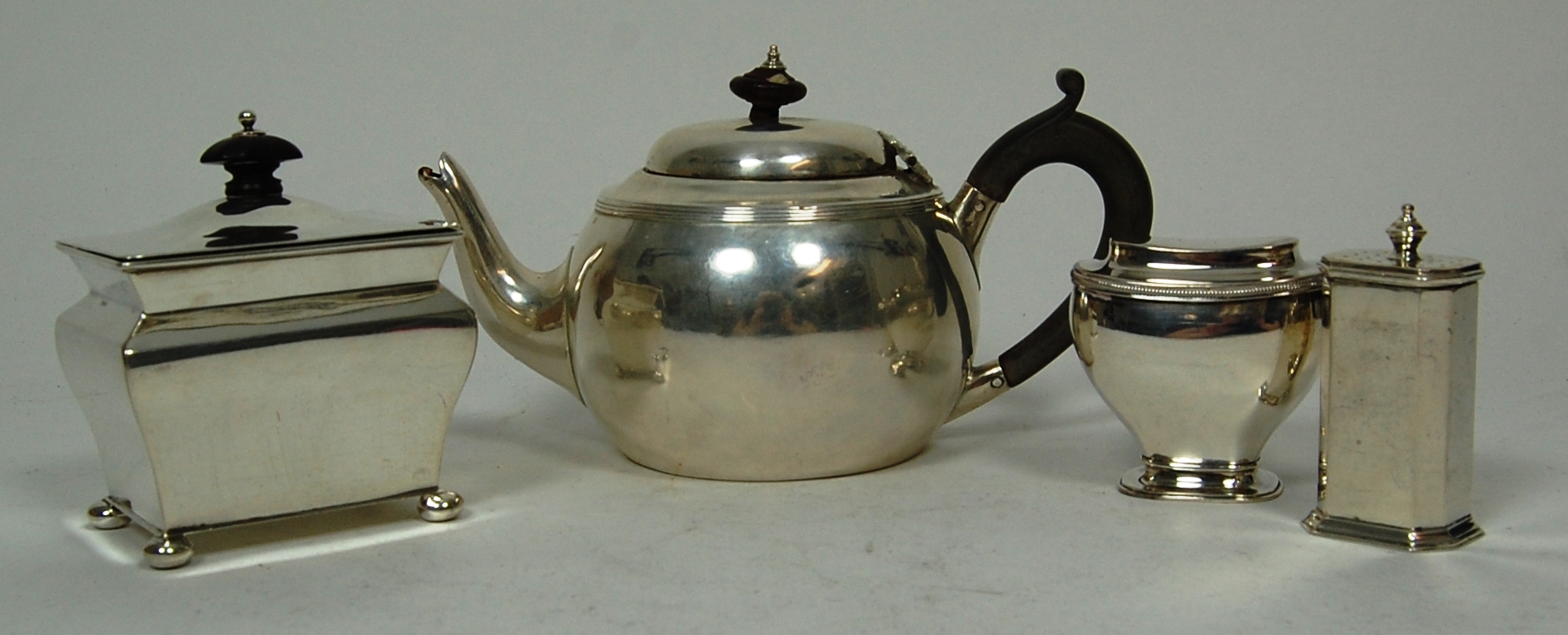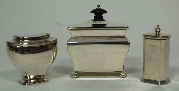 to include a batchelors teapot, London 1906, of simple form with wooden handle and straight spout; a Victorian tea caddy of tapered form with hinged cover and raised on ball feet Sheffield 1889; together with a Continental spice box and a modern pepperette (4)