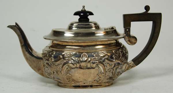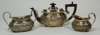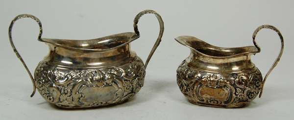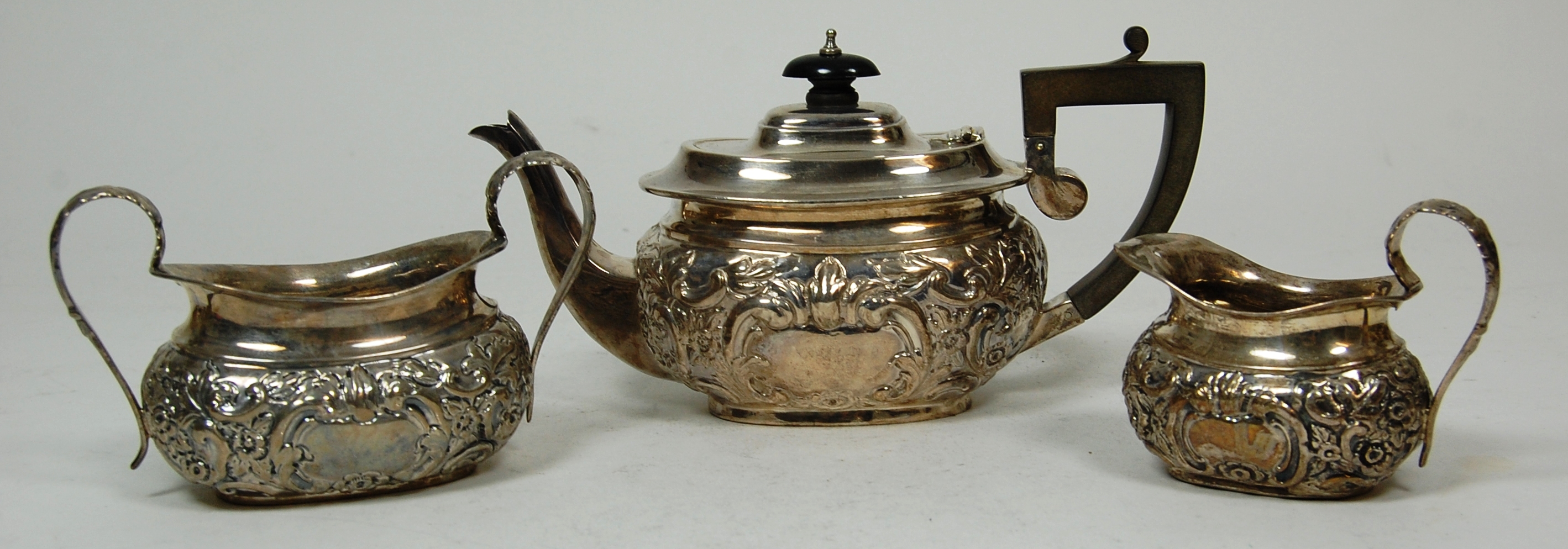 Nathan & Hayes, Chester 1899, comprising tea pot, twin handled sugar bowl and milk jug, the bellied bodies with embossed floral decoration, with acanthus S scroll handles (3)