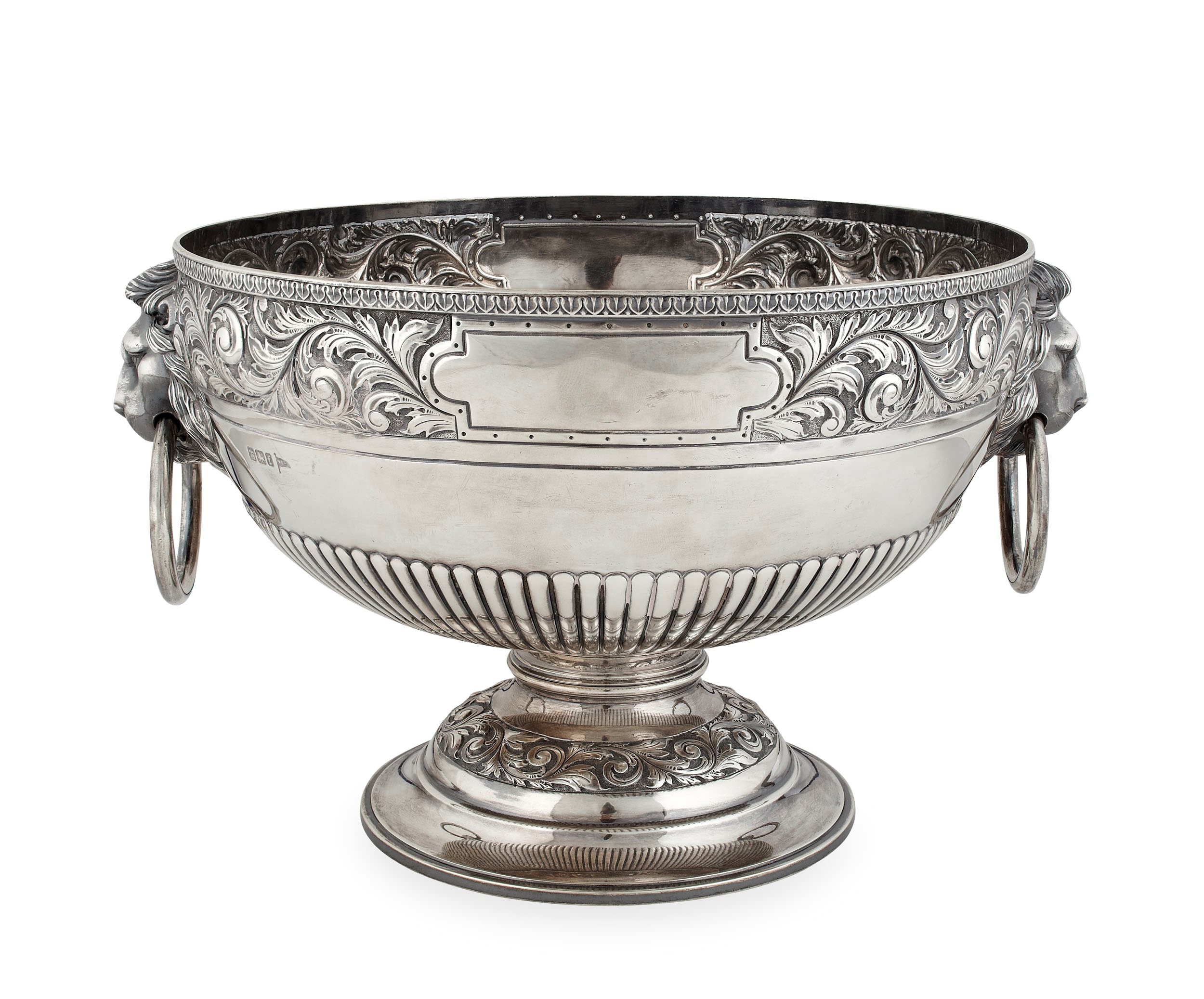 Walker & Hall, Sheffield 1898, of hemispherical form on a circular domed foot, with gadrooned detail to lower half of the bowl and foliate detail to the rim and similar detail to the foot, with twin lion mask drop ring handles