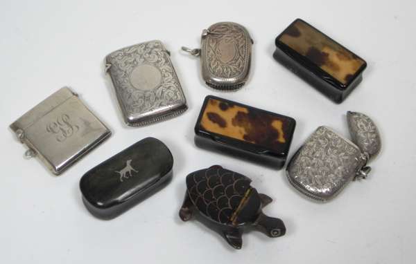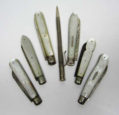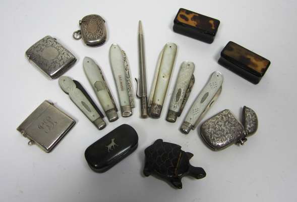 of typical form with engraved decoration and hinged covers; together with a group of four tortoiseshell boxes and six mother of pearl and silver fruit knives (qty)
