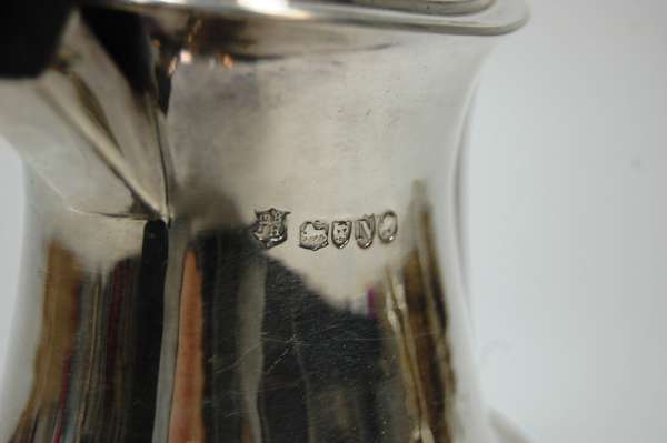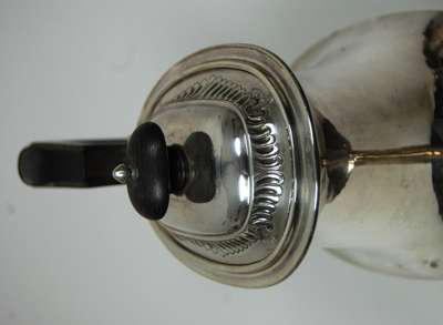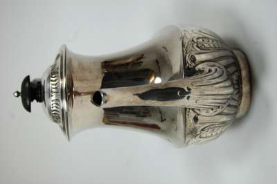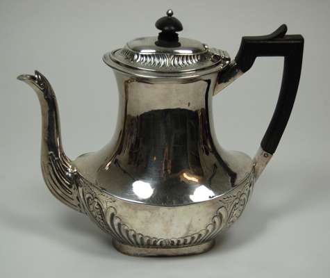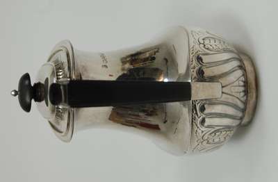 London 1862, of baluster form with gadrooned and floral decoration, decorated S scroll spout and wooden handle