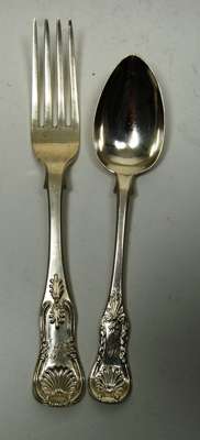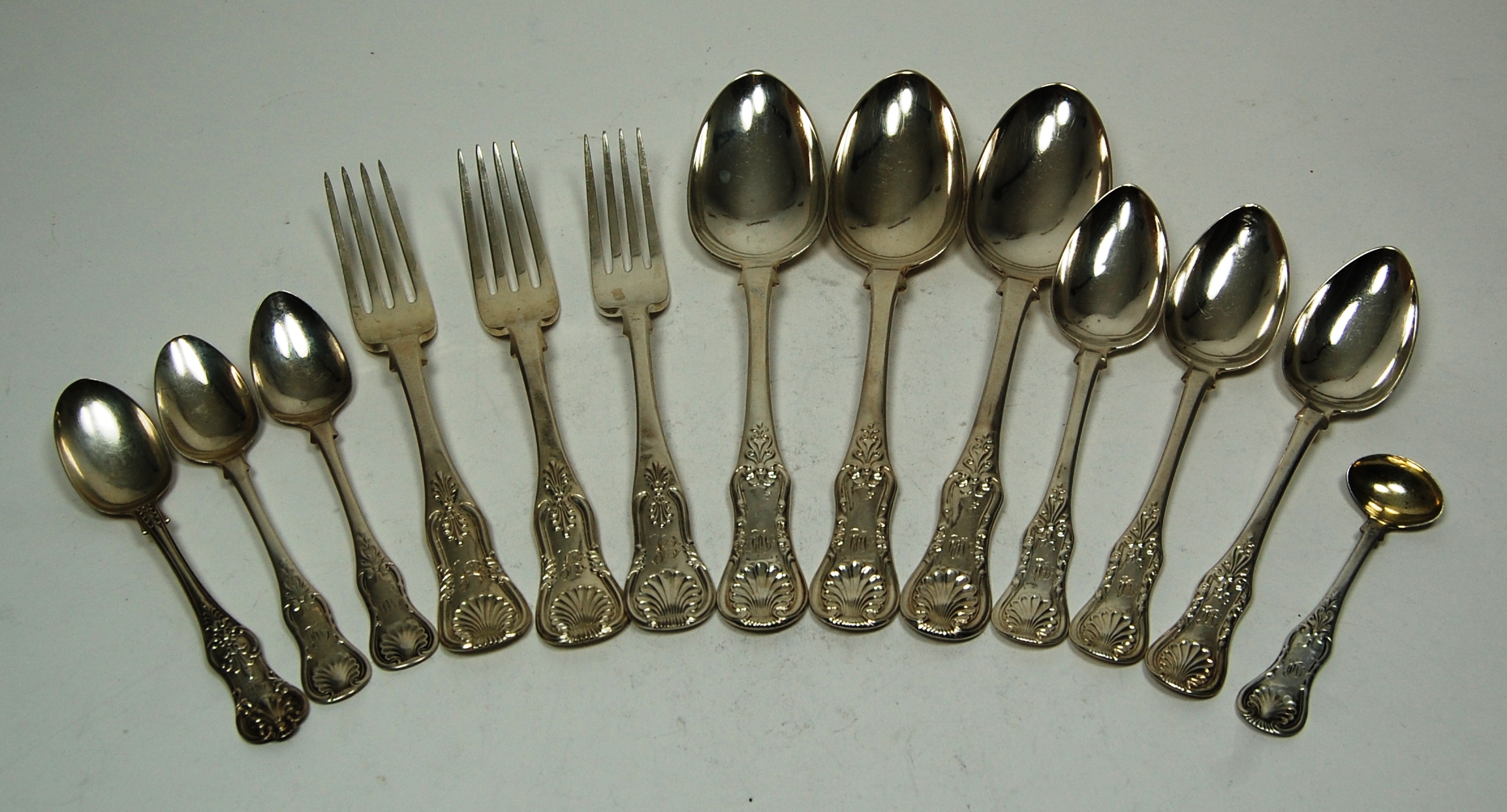 various dates and makers (mainly Victorian Edinburgh), of single struck Queen's pattern with engraved initials, comprising table spoons, dessert spoons, table forks and tea spoons (qty)