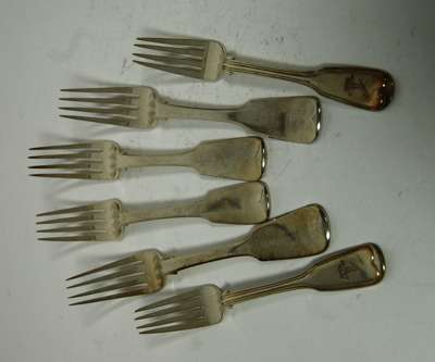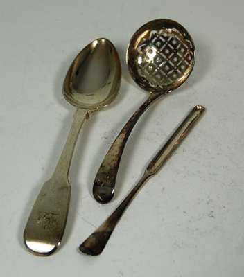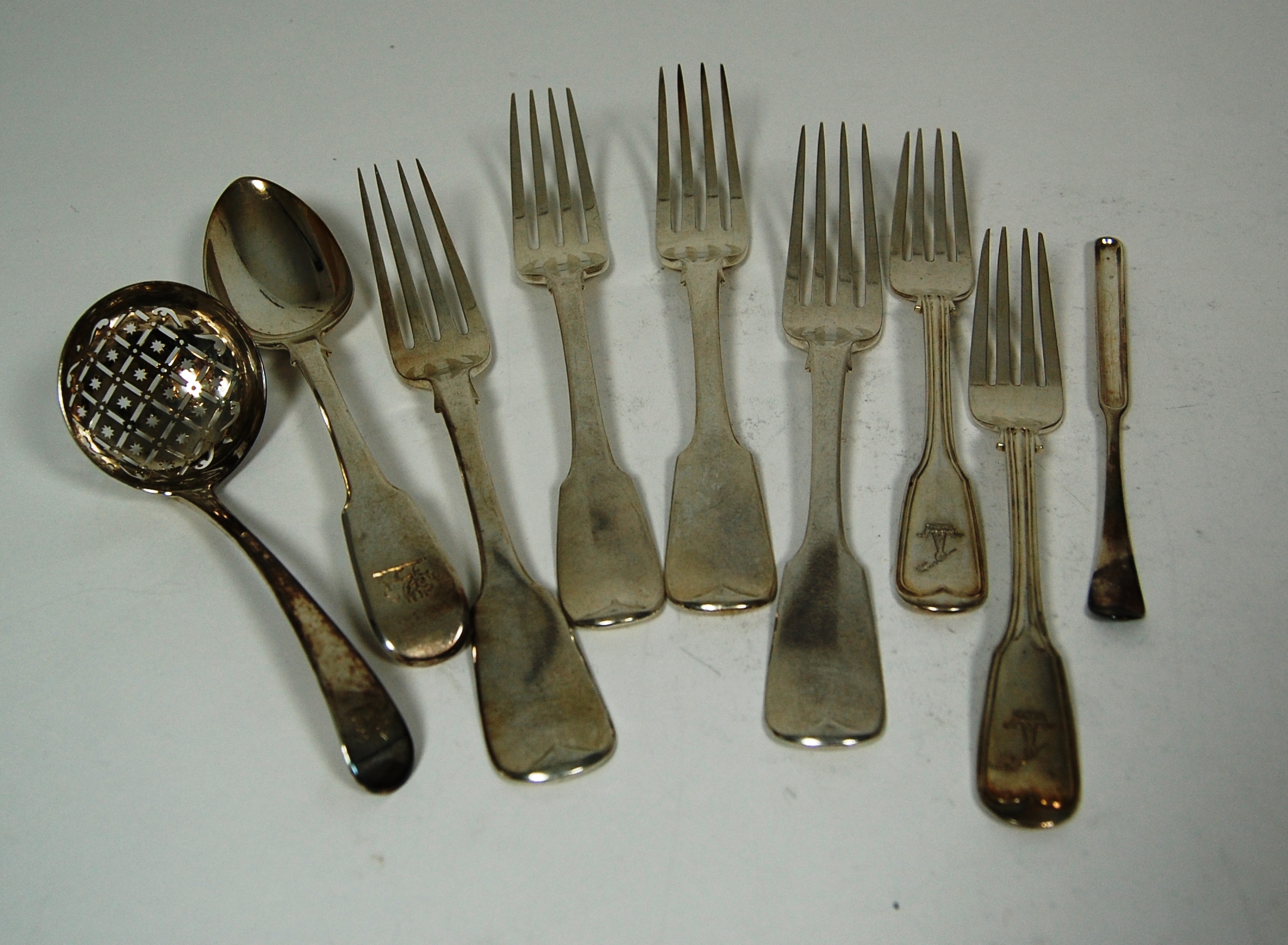 to include, four Fiddle pattern table forks; an Old English pattern sifter ladle; a marrow scoop etc. (qty)