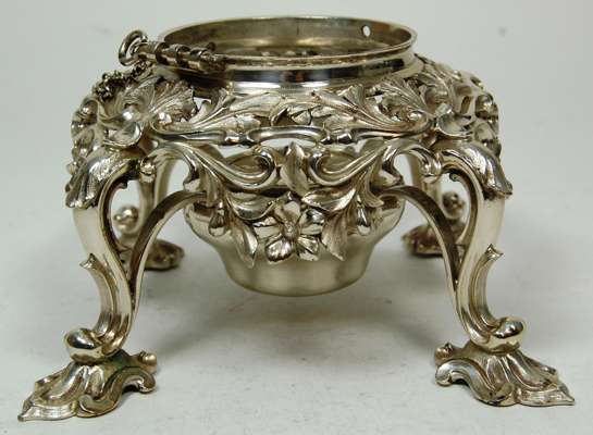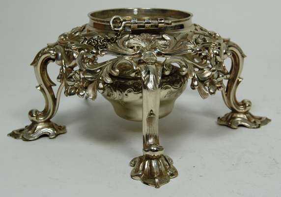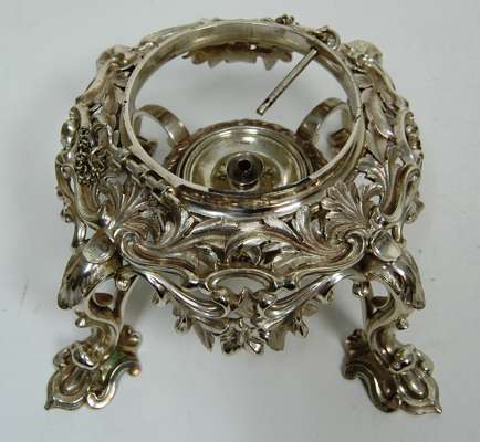 Barnards, London 1839, formed of four scrolling supports with acanthus capped detail and trefoil foot, the main frame of fineley chased and pierced foliage with central fixed border