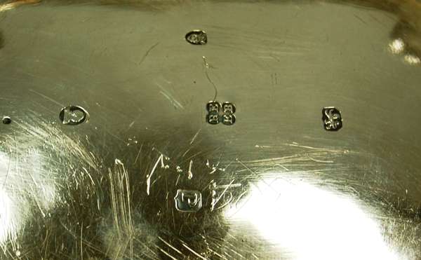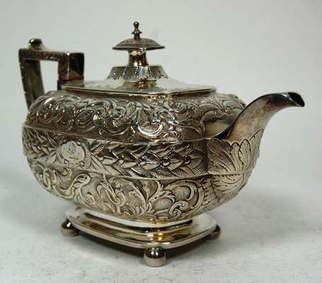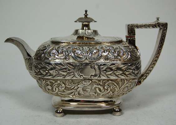 Emes & Barnard, London 1815, the main body and cover profusely embossed with scrolls and foliate, with engraved embossed girdle, raised on a short stem and simple foot