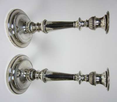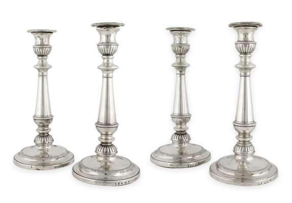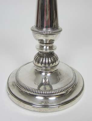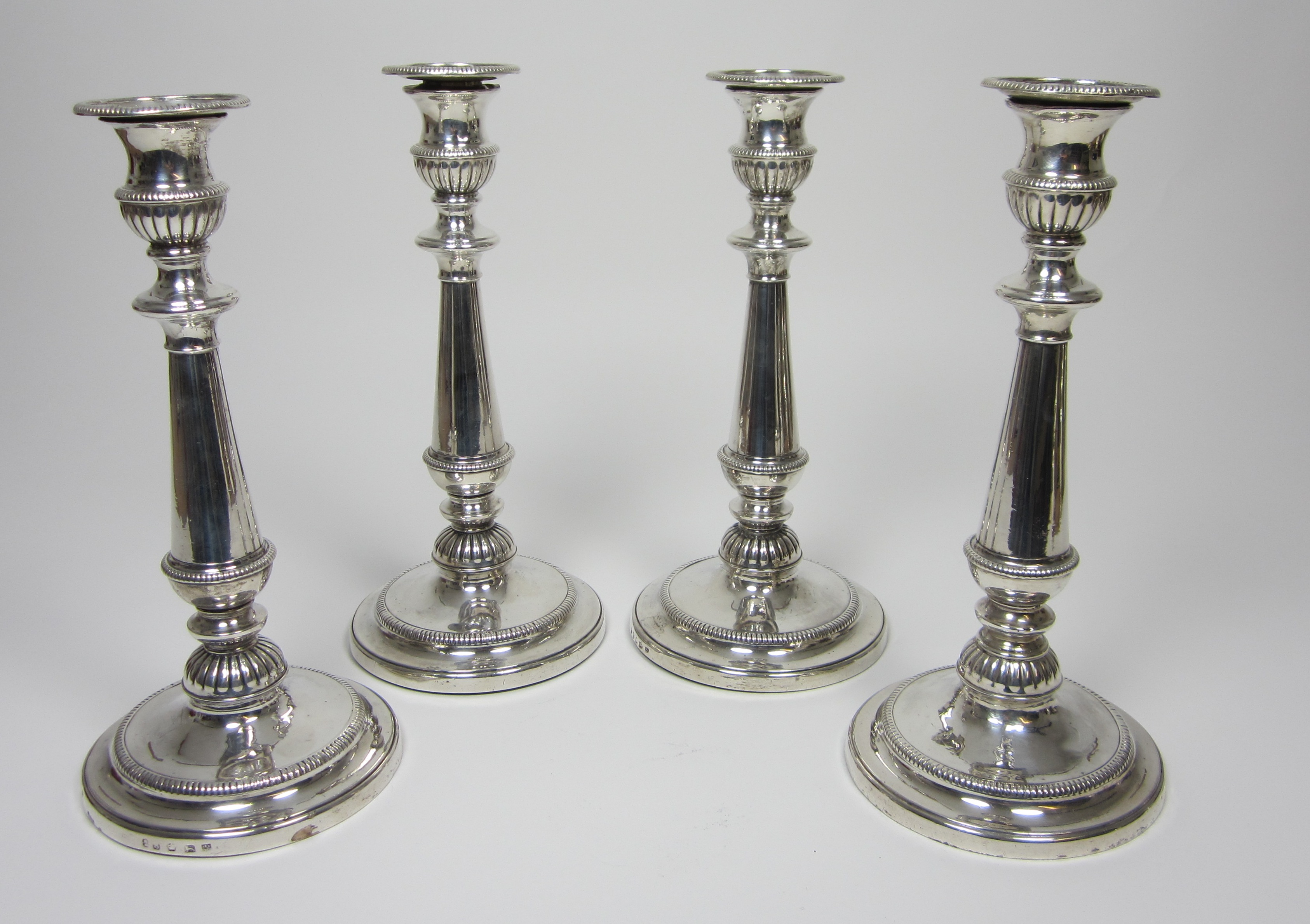 John Younge & Sons, Sheffield 1807, the fluted sconce with a flared and knopped stem, the circular base with gadrooned rims (4)