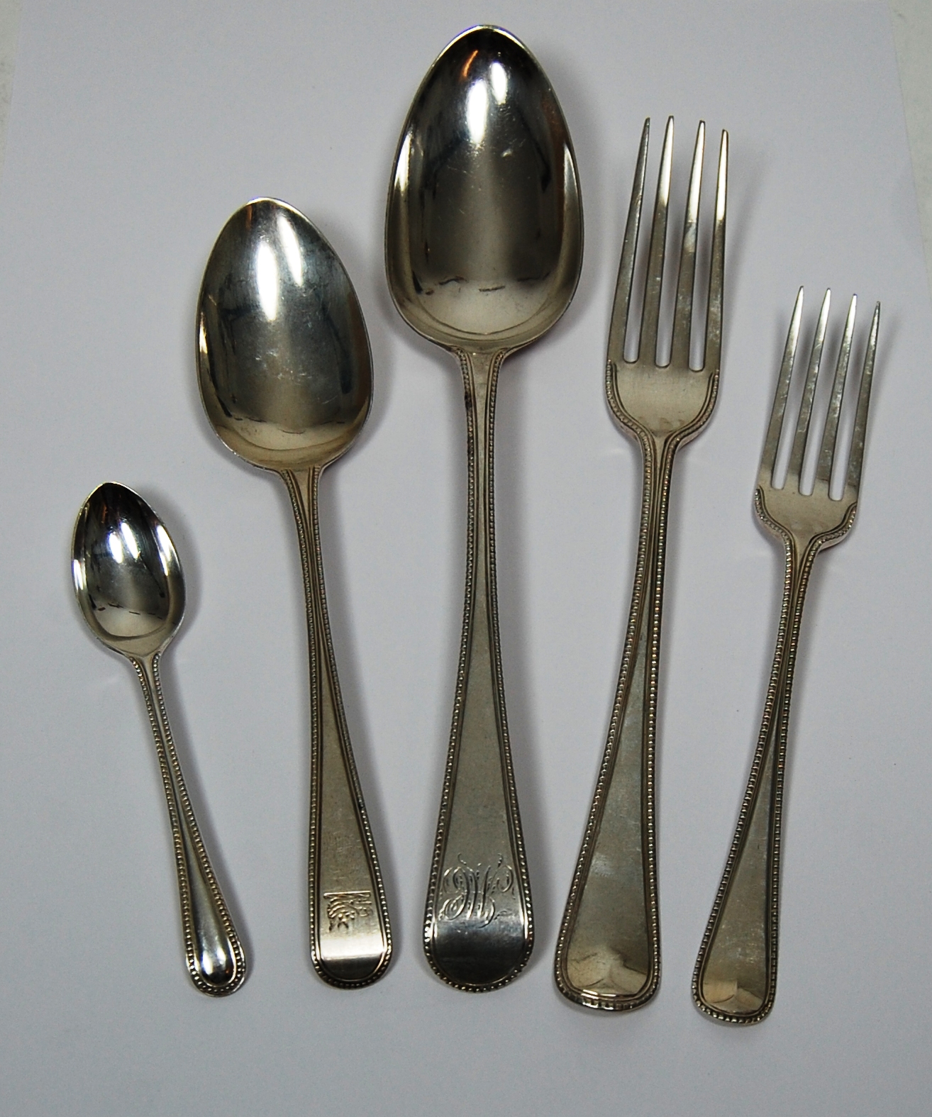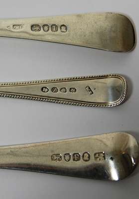 various dates and makers, mainly George III, to include six tea spoons, six table spoons, six dessert spoons, six table forks, six dessert forks, some with engraved crest (30)