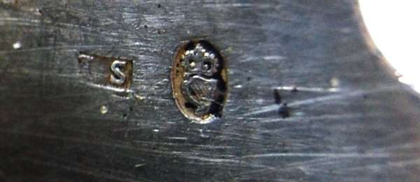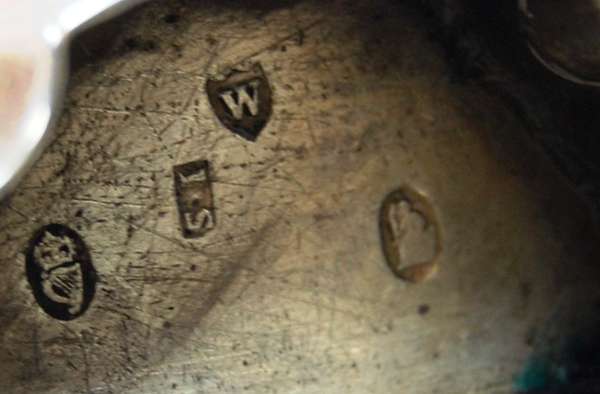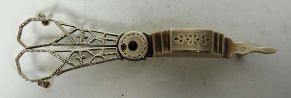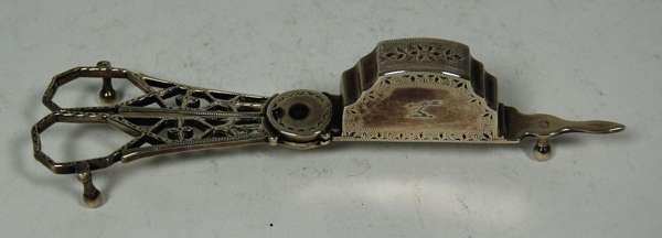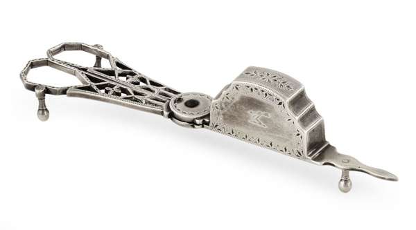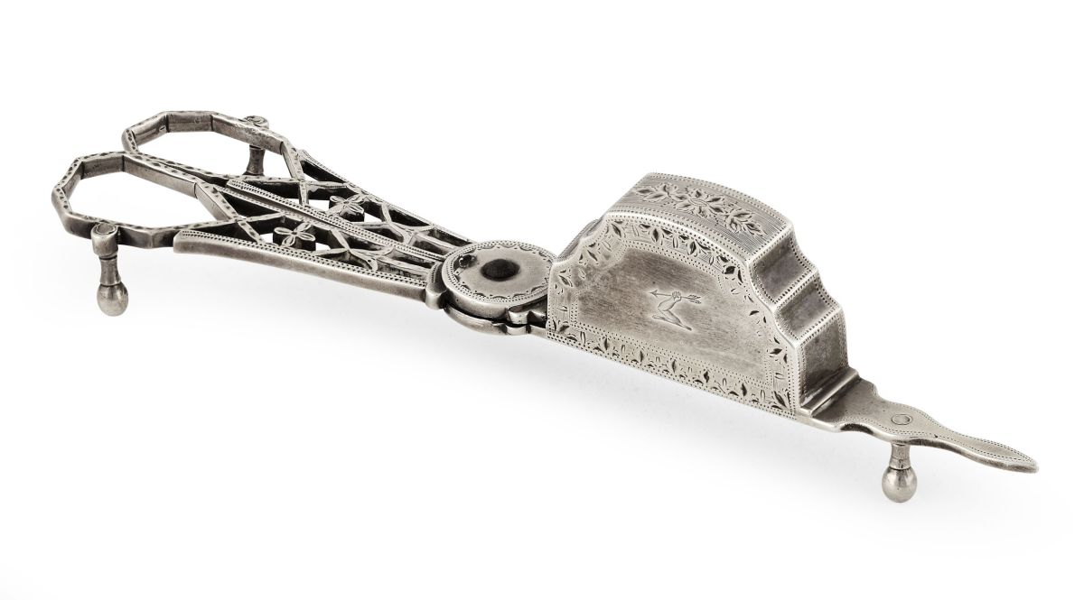 James Scott, Dublin 1793, of scissor action with open wirework loop handles with bright cut decoration, the main section with engraved borders and crest, raised on three simple supports