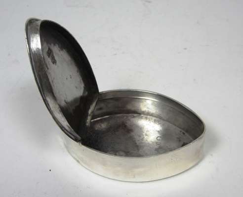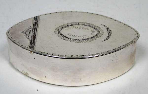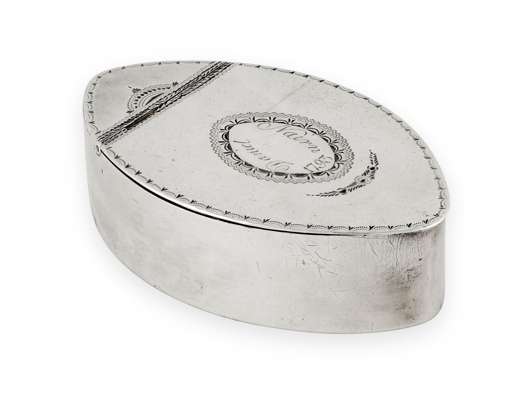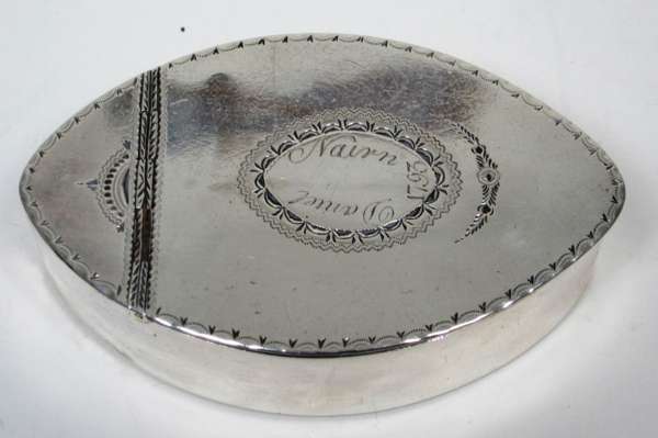 IM, London 1789, of navette outline with flush hinged cover with bright cut border and cartouche, inscribed 'Daniel Nairn 1793'