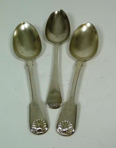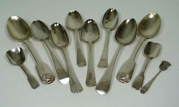to include various Hanoverian tablespoons, some with shell back decoration; various Fiddle pattern spoons and salt shovel, etc (qty)