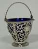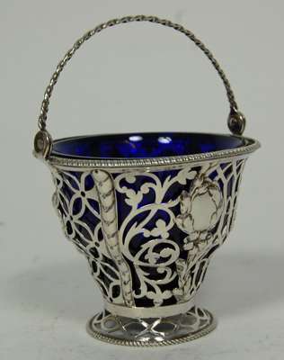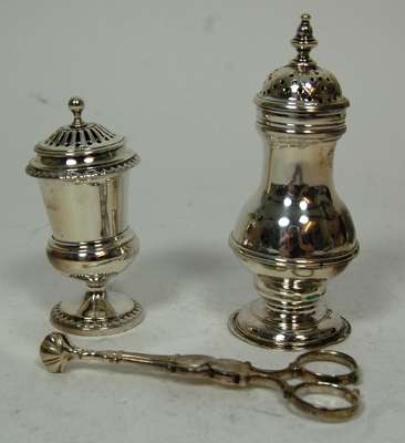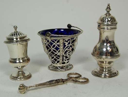 Charles Alderidge & Henry Green, London, 1770, pierced foliate decoration with a blue glass liner on a circular pierced foot, together with a George III sugar caster of baluster form, London 1763; a small pepper London 1779 and a pair of sugar nips (4)