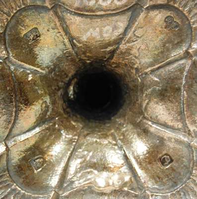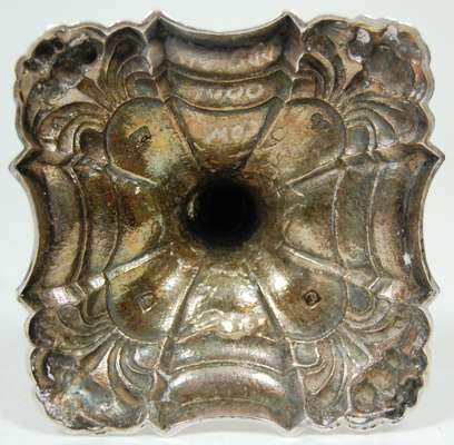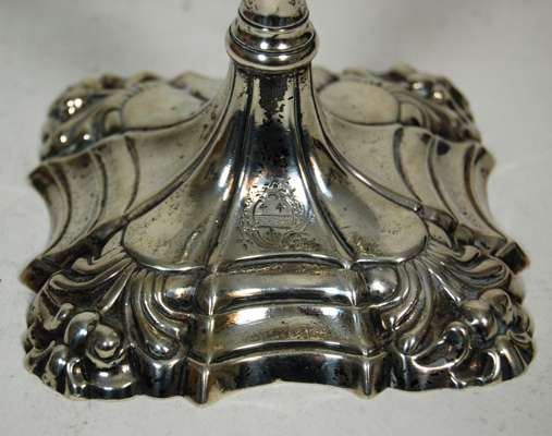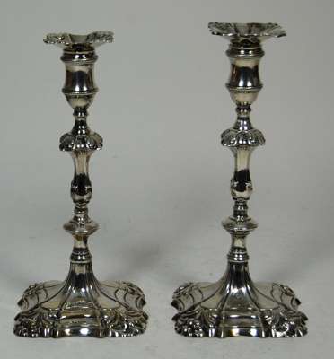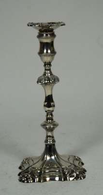 Willian Cafe, London 1758, of conventional form with knopped stem, on a swept square foot with scrolling decoration, engraved armorial to foot, the detachable square sconce with shell detail (2)
