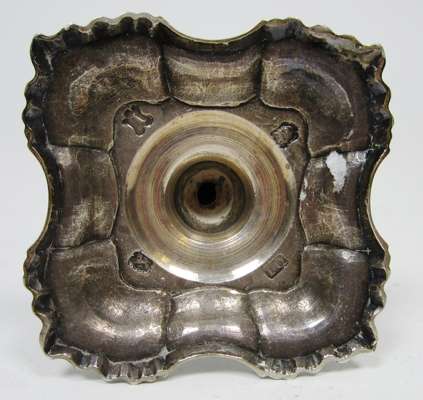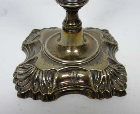 II, London 1752, the baluster socket with pull out sconce, above foliate capped tapering stem resting and a shaped square base with foliate corners