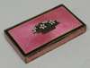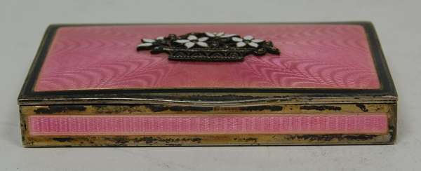 London import marks 1907, of rectangular outline with pink guilloche enamel cover and sides and cover with applied basket of flowers with enamel details