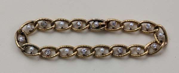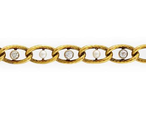 slight planished oval links, alternately set old mine cut diamonds and seed pearls, clasp set with a monogram