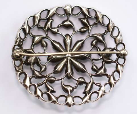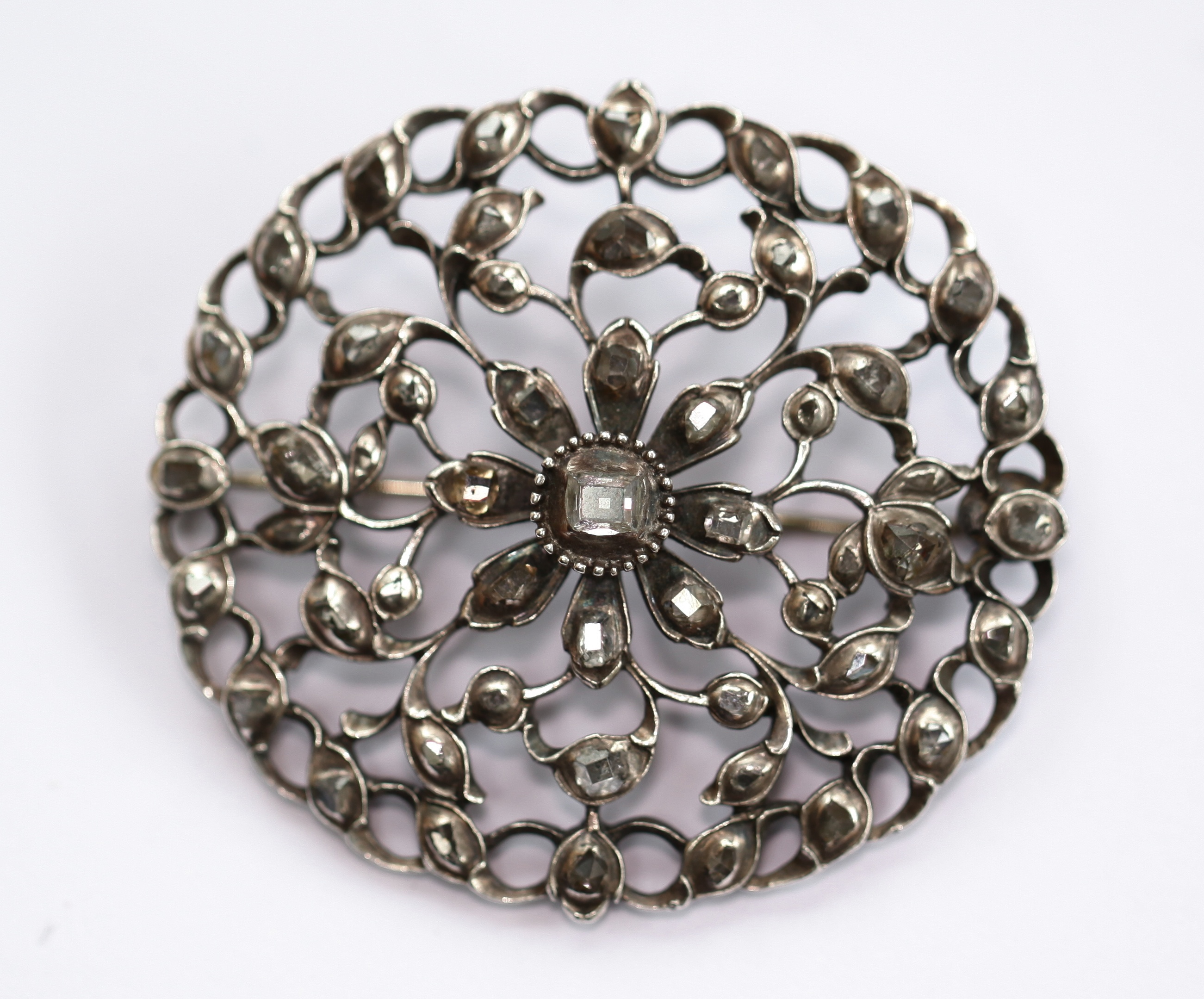 of pierced oval form, composed of foliate scrolls, set throughout with rose cut diamonds around the central floral cluster millegrain set with a table cut diamond