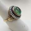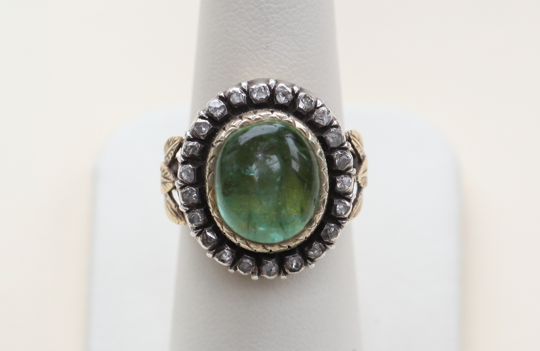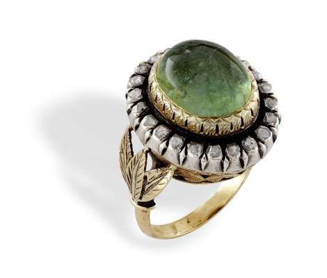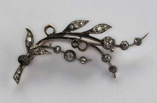 the oval foil backed cabochon emerald with a rose cut diamond set border, scroll pierced gallery, leaf clasping to the shank, together with a diamond set spray brooch of floral form, set in silver with gold backing, (parts lacking) (2)