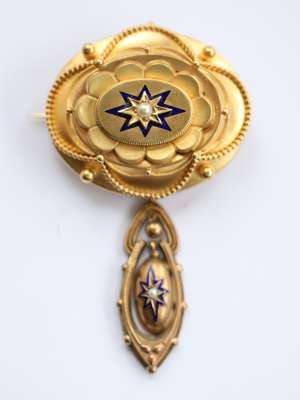 of girandole design, star set to the centre with a seed pearl, within a deep blue enamelled star shaped border, within outer petal shaped, ropetwisted and beaded borders, suspending a similarly decorated tapering drop, with glazed oval panel to reverse