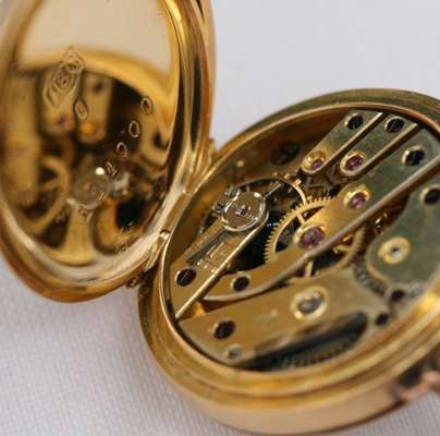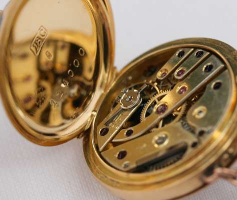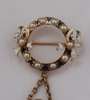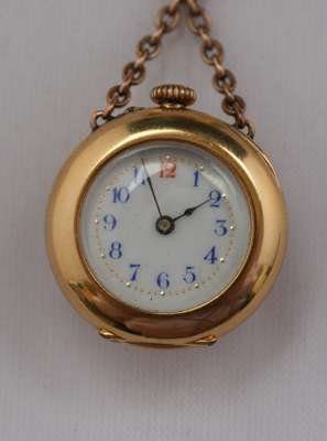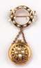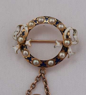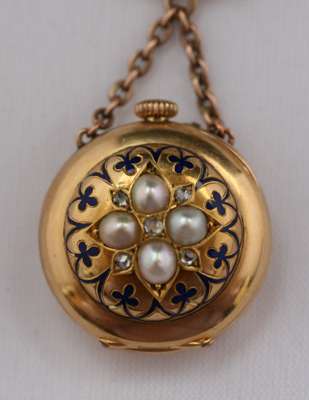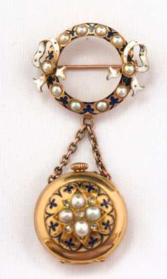 the blue and white enamel brooch fitting of ribbon form, set half pearls, the 18K gold fob watch, enamel dial in colours, the reverse with half pearl and diamond set motif with enamel detail