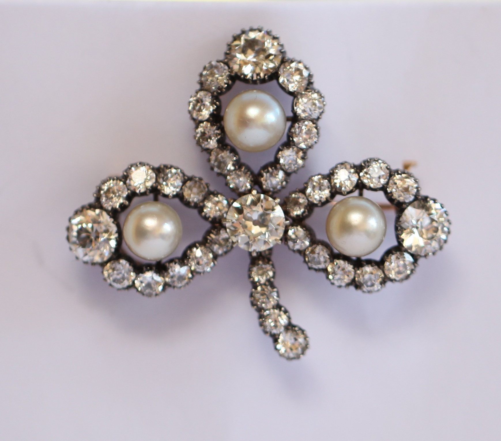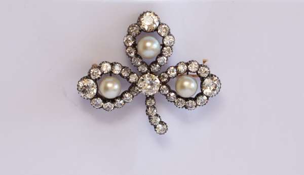 An Edwardian bouton pearl and diamond set shamrock form brooch