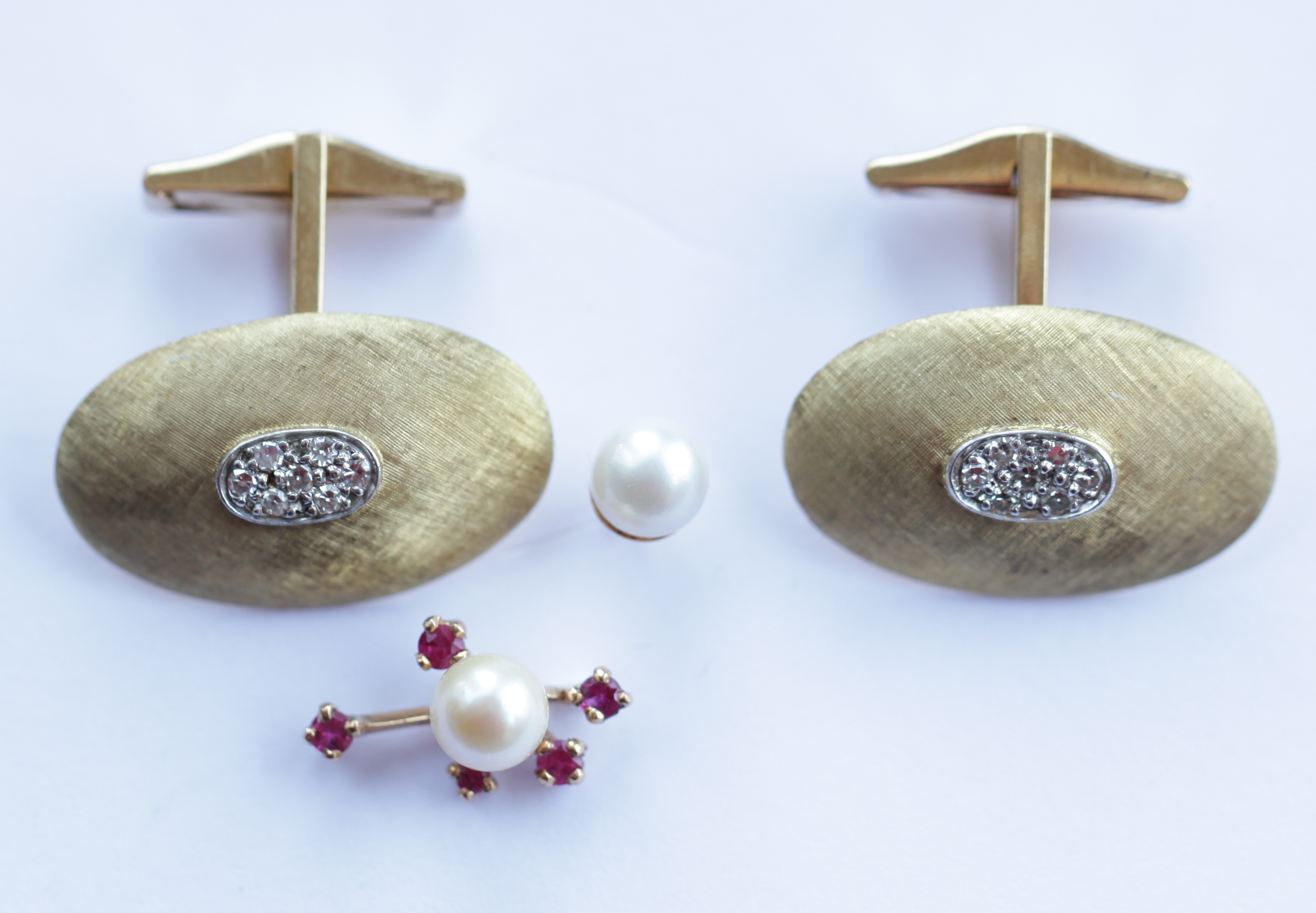 each with oval front with textured finish and central oval panel pave set with single cut diamonds, with swivel backs, monogrammed and stamped 434 B, contained in a fitted case stamped MAPPIN & WEBB LTD, together with a ruby and cultured pearl set stickpin, the terminal designed as the Southern star, and another cultured pearl set stickpin (3)