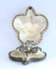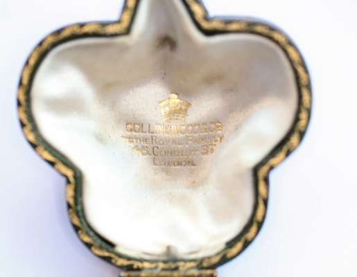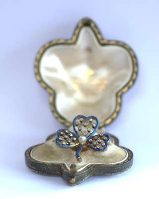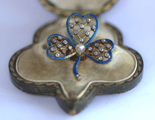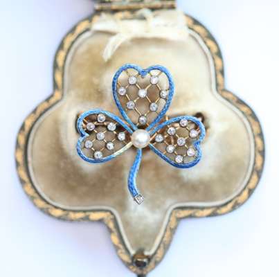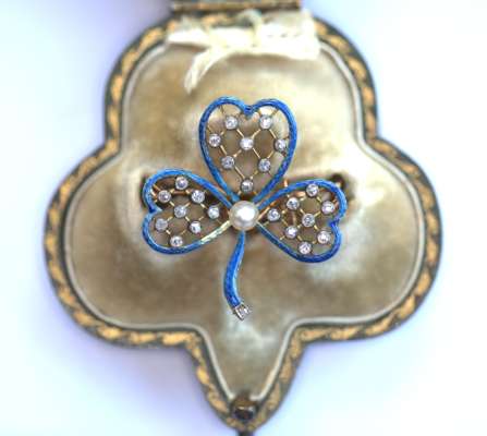 of open form,set to the centre with an ovoid cultured pearl, the three petals each with blue guilloche enalled edge and knife-bar lattice to centre highlighted with collet set old mine cut diamonds, with detachable brooch fitting, contained in a shamrock shaped tooled green leather fitted case, stamped COLLINGWOOD & CO...LONDON