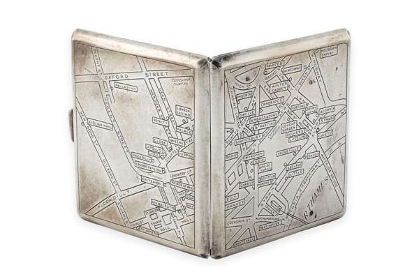 of hinged slim square form, engraved with a London street map indicating theatres, the gilt interior inscribed SHANE JACKSON 1939