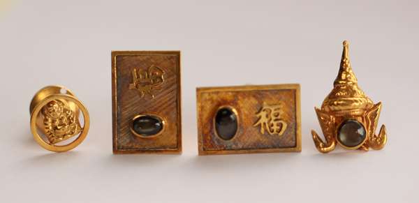 combined with a pair of diamond set earstuds of plaque form set small eight cut diamonds; a pair of 14k gold cufflinks set chrysoberyl, two 14k gold tie tacks; a silver cigarette case with engine turned decoration (qty)