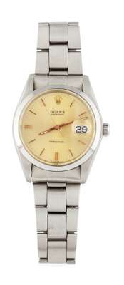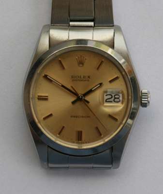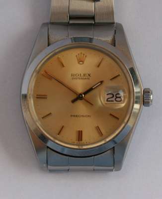 stainless steel case, dark champagne dial, baton numerals, inscribed Rolex Oysterdate, Precision, integral steel bracelet, numbered 6694 and 389 1287 at the lugs, screw down winder